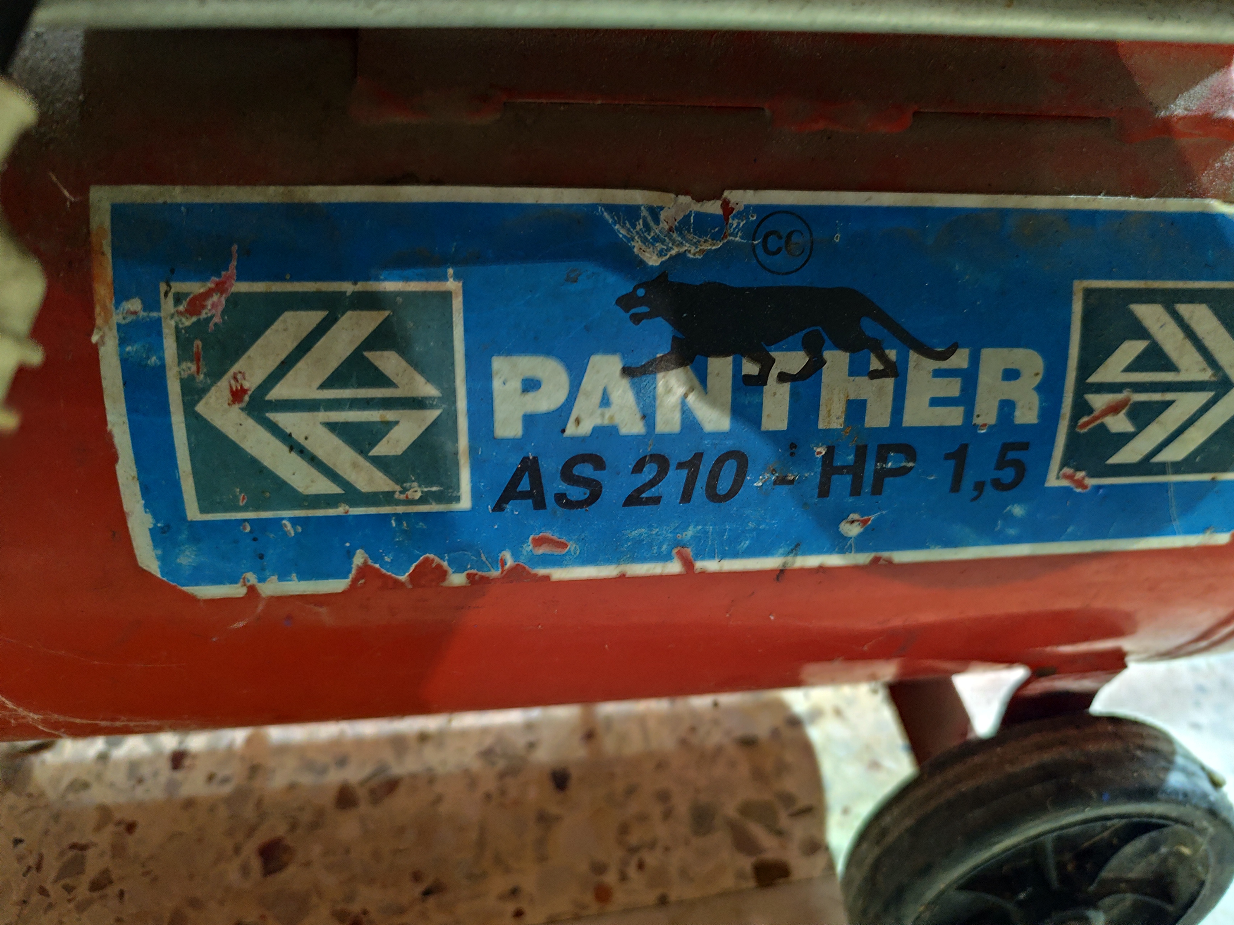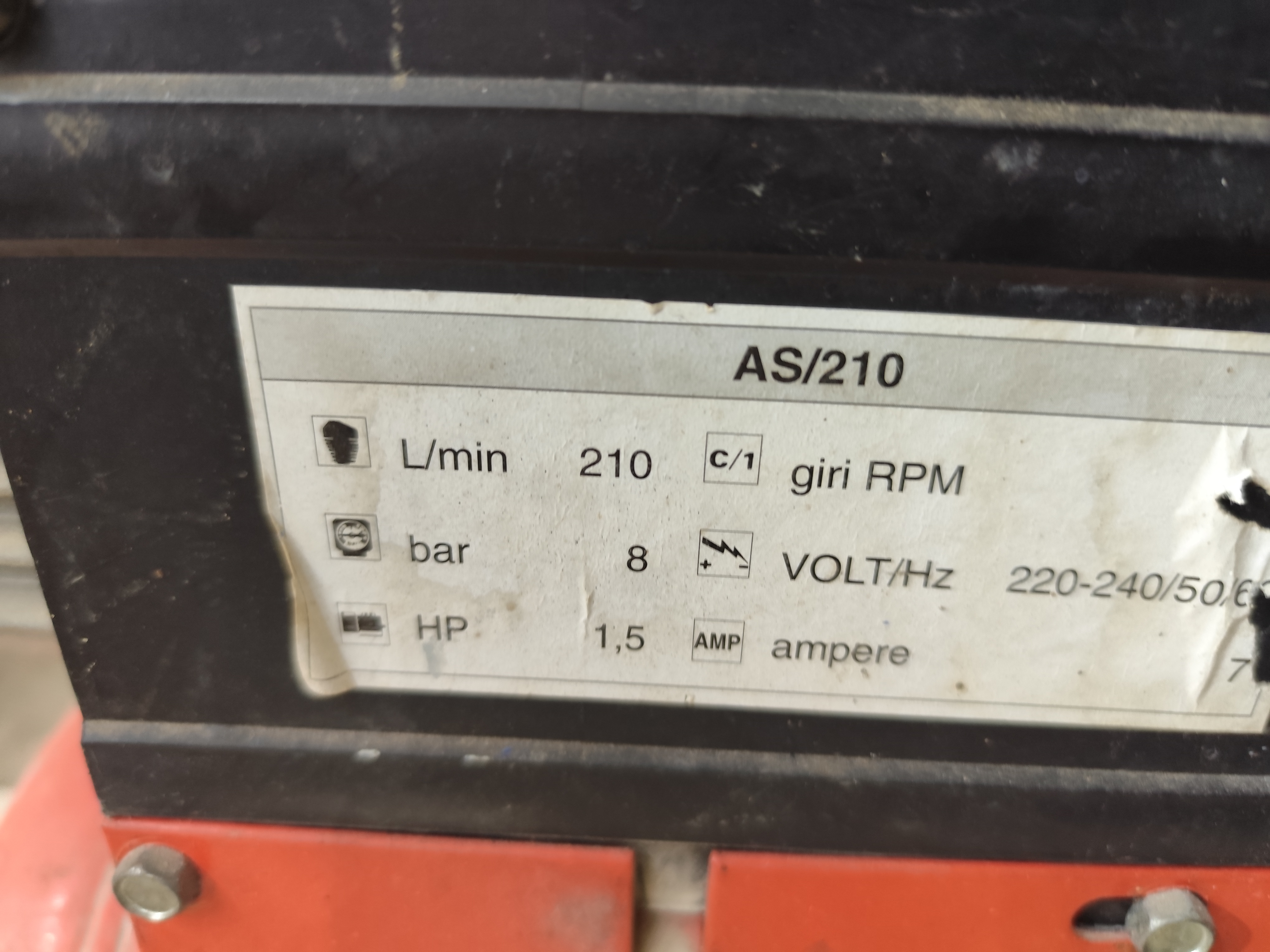 Compressore Panther AS210 - 1,5 HP - 8 bar 210 L/min - Contenitore dell' aria con capacità 24 L - 0,27 m³ (9,5 piedi cubici al minuto) Pressione dell' aria - Max 8 Bar (116 PSI) Pressione di lavoro - Equipaggiata con valvola di sicurezza e riduttore di pressione con misuratore per la regolazione dell' aria